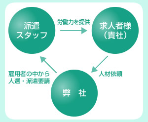 弊社と雇用関係にある派遣スタッフが、派遣先企業様の指揮命令を受けて労働に従事するシステムです。最もオーソドックスな派遣スタイルです。